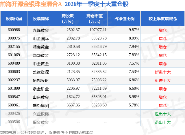 证券之星消息,日前前海开源金银珠宝混合A基金公布一季报,2026年一季度最新规模22.18亿元,季度净值涨幅为15.45%。