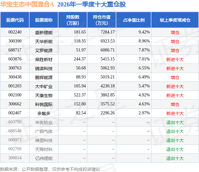 从基金规模来看,华宝生态中国混合A基金2026年一季度公布的基金规模为5.15亿元,较上一期规模4.72亿元变化了4368.42万元,环比变化了9.26%。该基金最新一期资产配置为:股票占净值比91.51%,无债券类资产,现金占净值比7.72%。从基金持仓来看,该基金当季前十大股票仓位达64.29%,第一大重仓股为盛新锂能(002240),持仓占比为9.42%。