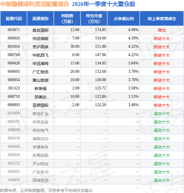 从基金规模来看,中邮稳健添利灵活配置混合基金2026年一季度公布的基金规模为0.35亿元,较上一期规模5971.7万元变化了-2461.86万元,环比变化了-41.23%。该基金最新一期资产配置为:股票占净值比92.79%,无债券类资产,现金占净值比7.97%。从基金持仓来看,该基金当季前十大股票仓位达39.82%,第一大重仓股为嘉友国际(603871),持仓占比为4.98%。