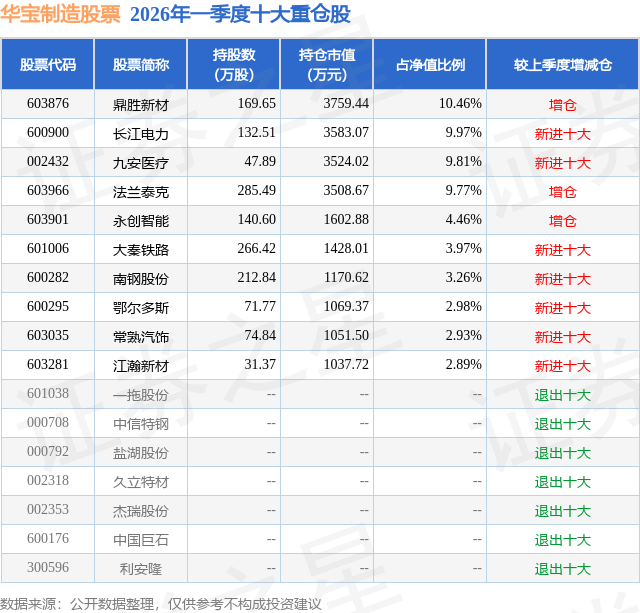 从基金规模来看,华宝制造股票基金2026年一季度公布的基金规模为3.59亿元,较上一期规模1.75亿元变化了1.84亿元,环比变化了105.49%。该基金最新一期资产配置为:股票占净值比90.74%,无债券类资产,现金占净值比10.66%。从基金持仓来看,该基金当季前十大股票仓位达60.5%,第一大重仓股为鼎胜新材(603876),持仓占比为10.46%。