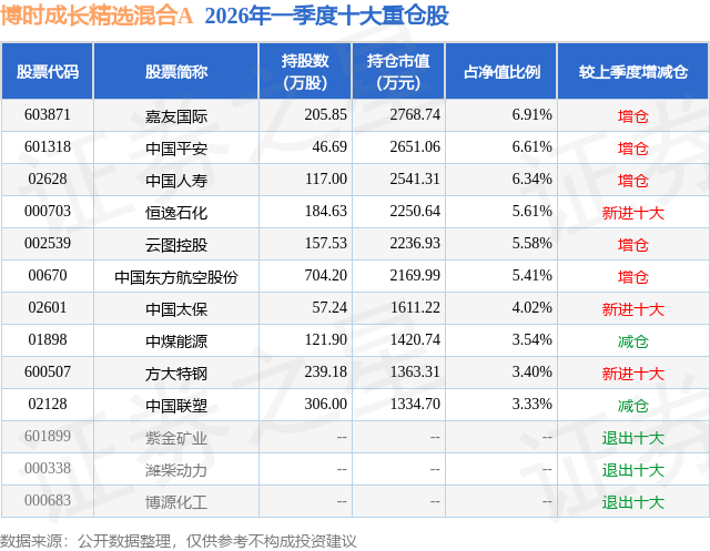 从基金规模来看,博时成长精选混合A基金2026年一季度公布的基金规模为2.98亿元,较上一期规模6.07亿元变化了-3.09亿元,环比变化了-50.95%。该基金最新一期资产配置为:股票占净值比82.82%,债券占净值比0.35%,现金占净值比16.42%。从基金持仓来看,该基金当季前十大股票仓位达50.75%,第一大重仓股为嘉友国际(603871),持仓占比为6.91%。