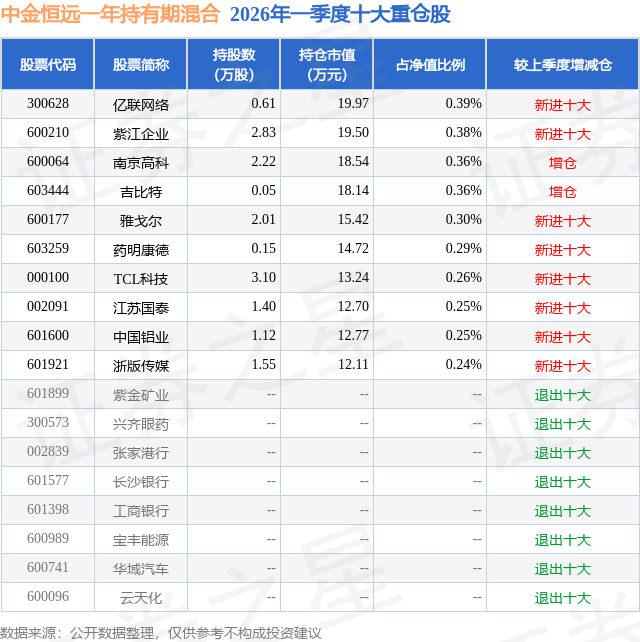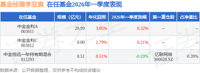 证券之星消息,日前中金恒远一年持有期混合基金公布一季报,2026年一季度最新规模0.51亿元,季度净值涨幅为-0.19%。