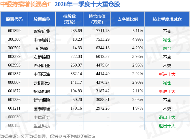 从基金规模来看,中银持续增长混合C基金2026年一季度公布的基金规模为0.16亿元,较上一期规模1635.66万元变化了-40.03万元,环比变化了-2.45%。该基金最新一期资产配置为:股票占净值比83.4%,债券占净值比2.4%,现金占净值比14.04%。从基金持仓来看,该基金当季前十大股票仓位达33.19%,第一大重仓股为紫金矿业(601899),持仓占比为5.11%。