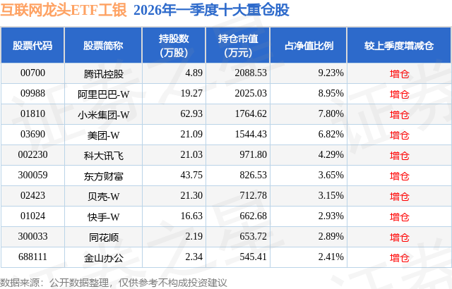 从基金规模来看,互联网龙头ETF工银基金2026年一季度公布的基金规模为2.26亿元,较上一期规模2.61亿元变化了-3452.2万元,环比变化了-13.23%。该基金最新一期资产配置为:股票占净值比98.65%,无债券类资产,现金占净值比1.41%。从基金持仓来看,该基金当季前十大股票仓位达52.12%,第一大重仓股为腾讯控股(00700),持仓占比为9.23%。