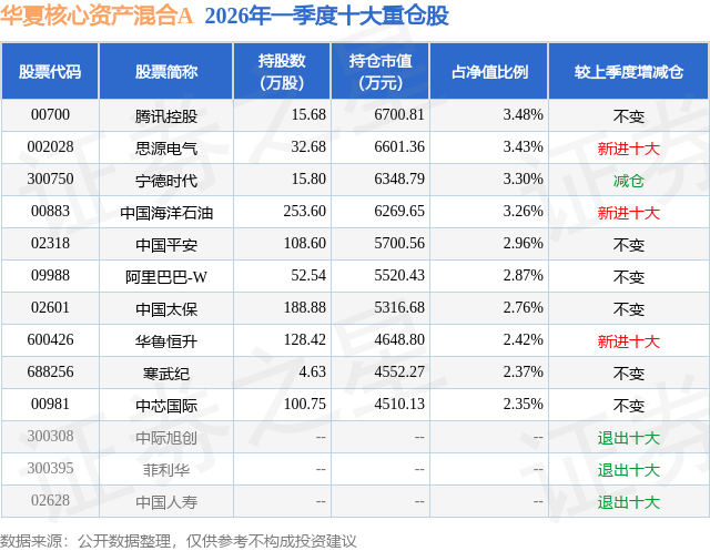 从基金规模来看,华夏核心资产混合A基金2026年一季度公布的基金规模为16.45亿元,较上一期规模19.22亿元变化了-2.77亿元,环比变化了-14.42%。该基金最新一期资产配置为:股票占净值比80.4%,债券占净值比3.7%,现金占净值比13.5%。从基金持仓来看,该基金当季前十大股票仓位达29.2%,第一大重仓股为腾讯控股(00700),持仓占比为3.48%。