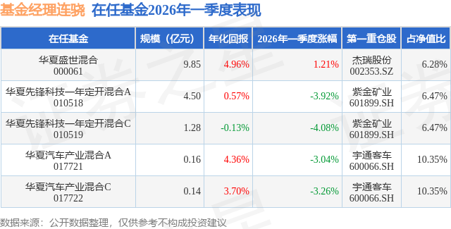 从基金规模来看,华夏先锋科技一年定开混合C基金2026年一季度公布的基金规模为1.28亿元,较上一期规模1.17亿元变化了1086.13万元,环比变化了9.28%。该基金最新一期资产配置为:股票占净值比95.62%,无债券类资产,现金占净值比4.12%。从基金持仓来看,该基金当季前十大股票仓位达50.18%,第一大重仓股为紫金矿业(601899),持仓占比为6.47%。