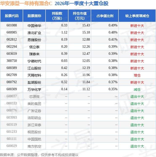 从基金规模来看,华安添益一年持有混合C基金2026年一季度公布的基金规模为0.06亿元,较上一期规模1721.21万元变化了-1113.17万元,环比变化了-64.67%。该基金最新一期资产配置为:股票占净值比8.53%,债券占净值比53.29%,现金占净值比30.1%。从基金持仓来看,该基金当季前十大股票仓位达4.02%,第一大重仓股为中国神华(601088),持仓占比为0.49%。