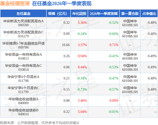 证券之星消息,日前华安宁享6个月混合C基金公布一季报,2026年一季度最新规模0.15亿元,季度净值涨幅为-0.57%。