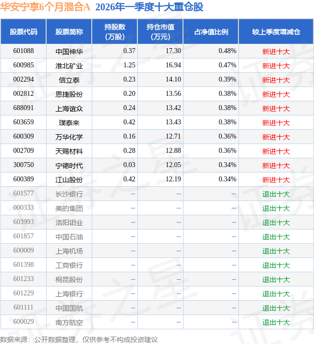 从基金规模来看,华安宁享6个月混合A基金2026年一季度公布的基金规模为0.21亿元,较上一期规模2325.81万元变化了-260.15万元,环比变化了-11.19%。该基金最新一期资产配置为:股票占净值比7.91%,债券占净值比53.03%,现金占净值比30.06%。从基金持仓来看,该基金当季前十大股票仓位达3.88%,第一大重仓股为中国神华(601088),持仓占比为0.48%。