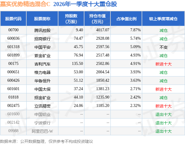 证券之星消息,日前嘉实优势精选混合C基金公布一季报,2026年一季度最新规模0.19亿元,季度净值涨幅为-7.4%。