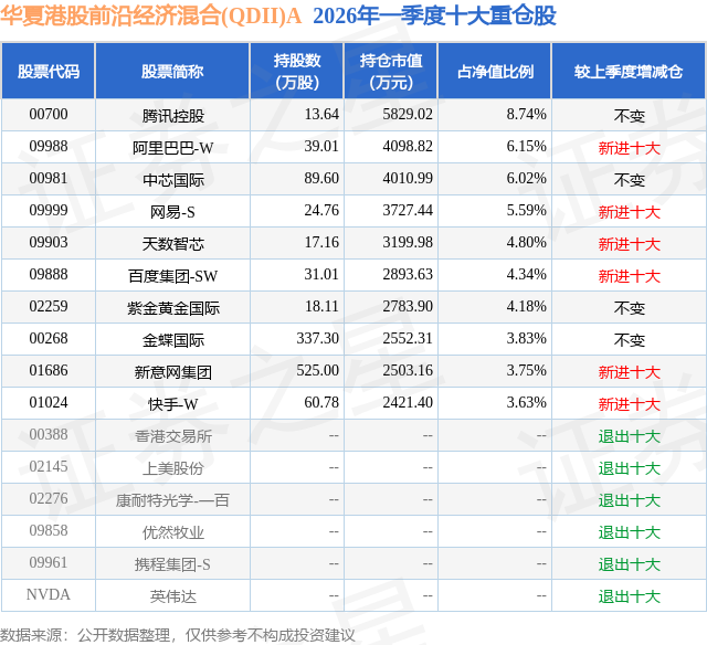 从基金规模来看,华夏港股前沿经济混合(QDII)A基金2026年一季度公布的基金规模为6.42亿元,较上一期规模7.57亿元变化了-1.15亿元,环比变化了-15.21%。该基金最新一期资产配置为:股票占净值比79.88%,无债券类资产,现金占净值比19.47%。从基金持仓来看,该基金当季前十大股票仓位达51.03%,第一大重仓股为腾讯控股(00700),持仓占比为8.74%。