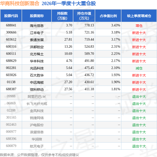 从基金规模来看,华商科技创新混合基金2026年一季度公布的基金规模为2.27亿元,较上一期规模1.8亿元变化了4642.7万元,环比变化了25.74%。该基金最新一期资产配置为:股票占净值比74.42%,无债券类资产,现金占净值比26.08%。从基金持仓来看,该基金当季前十大股票仓位达24.25%,第一大重仓股为海光信息(688041),持仓占比为3.43%。