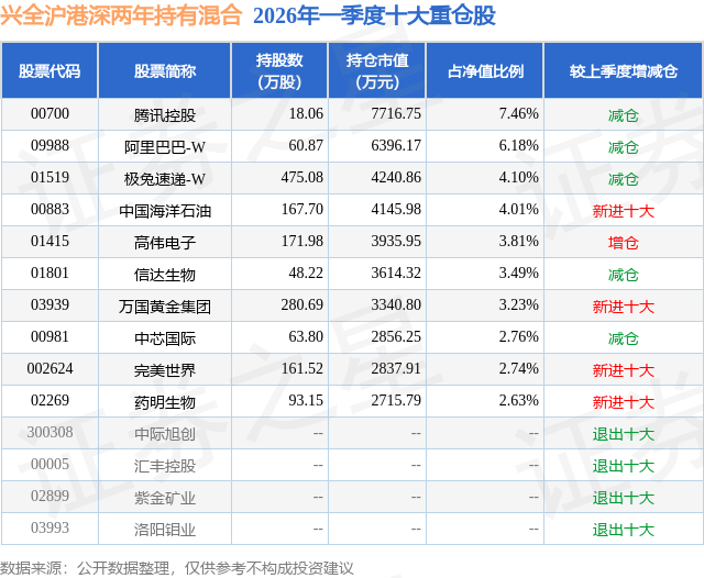 从基金规模来看,兴全沪港深两年持有混合基金2026年一季度公布的基金规模为10.34亿元,较上一期规模12.54亿元变化了-2.2亿元,环比变化了-17.54%。该基金最新一期资产配置为:股票占净值比89.83%,债券占净值比1.14%,现金占净值比11.04%。从基金持仓来看,该基金当季前十大股票仓位达40.41%,第一大重仓股为腾讯控股(00700),持仓占比为7.46%。
