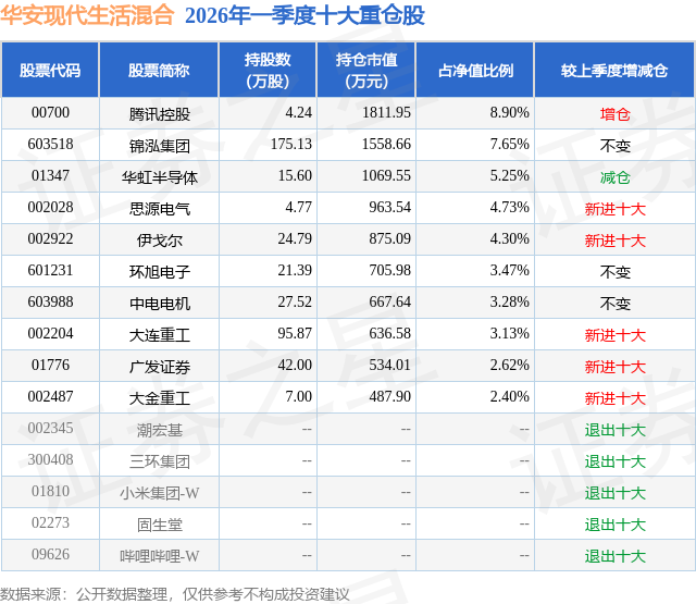 从基金规模来看,华安现代生活混合基金2026年一季度公布的基金规模为2.04亿元,较上一期规模1.7亿元变化了3407.68万元,环比变化了20.1%。该基金最新一期资产配置为:股票占净值比90.18%,债券占净值比2.47%,现金占净值比7.63%。从基金持仓来看,该基金当季前十大股票仓位达45.73%,第一大重仓股为腾讯控股(00700),持仓占比为8.9%。