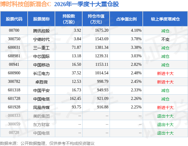 从基金规模来看,博时科技创新混合C基金2026年一季度公布的基金规模为1.92亿元,较上一期规模3.2亿元变化了-1.27亿元,环比变化了-39.85%。该基金最新一期资产配置为:股票占净值比61.31%,无债券类资产,现金占净值比39.09%。从基金持仓来看,该基金当季前十大股票仓位达28.88%,第一大重仓股为腾讯控股(00700),持仓占比为4.1%。