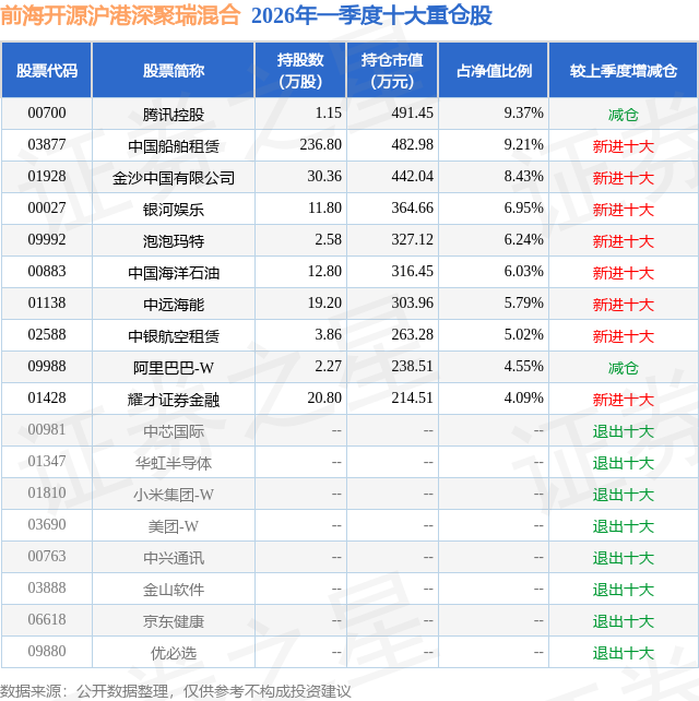 从基金规模来看,前海开源沪港深聚瑞混合基金2026年一季度公布的基金规模为0.52亿元,较上一期规模7310.96万元变化了-2064.89万元,环比变化了-28.24%。该基金最新一期资产配置为:股票占净值比86.19%,无债券类资产,现金占净值比11.24%。从基金持仓来看,该基金当季前十大股票仓位达65.68%,第一大重仓股为腾讯控股(00700),持仓占比为9.37%。