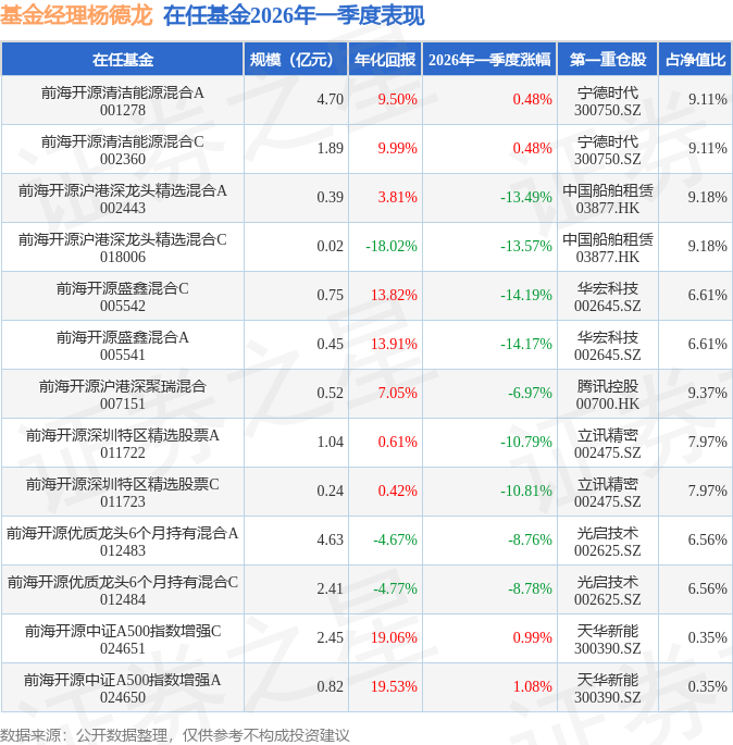 证券之星消息,日前前海开源沪港深聚瑞混合基金公布一季报,2026年一季度最新规模0.52亿元,季度净值涨幅为-6.97%。