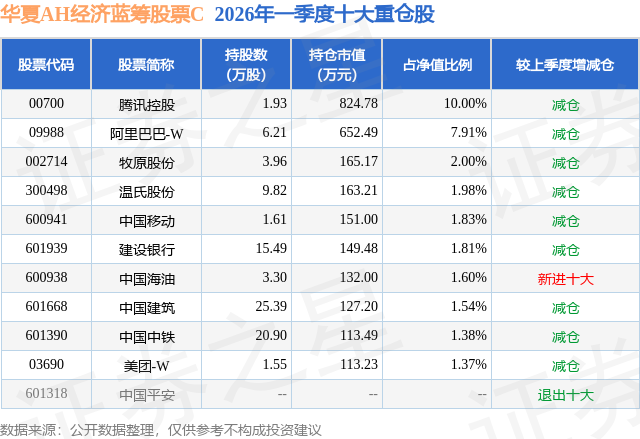 从基金规模来看,华夏AH经济蓝筹股票C基金2026年一季度公布的基金规模为0.45亿元,较上一期规模4983.88万元变化了-462.63万元,环比变化了-9.28%。该基金最新一期资产配置为:股票占净值比93.31%,债券占净值比3.05%,现金占净值比6.09%。从基金持仓来看,该基金当季前十大股票仓位达31.42%,第一大重仓股为腾讯控股(00700),持仓占比为10.0%。