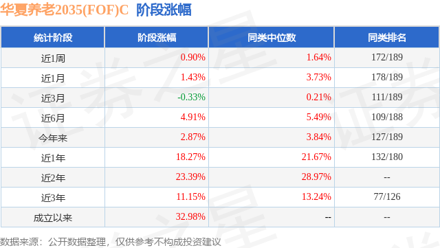 从业绩表现来看,华夏养老2035(FOF)C基金过去一年净值涨幅为18.27%,在同类基金中排名132/180,同类基金过去一年净值涨幅中位数为21.67%。而基金过去一年的最大回撤为-6.2%,成立以来的最大回撤为-30.16%。