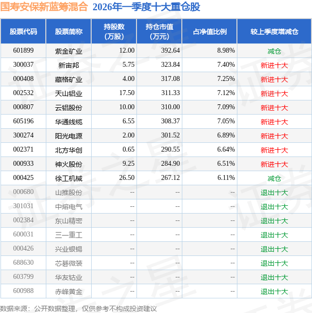 从基金规模来看,国寿安保新蓝筹混合基金2026年一季度公布的基金规模为0.44亿元,较上一期规模9227.4万元变化了-4852.94万元,环比变化了-52.59%。该基金最新一期资产配置为:股票占净值比93.77%,债券占净值比0.46%,现金占净值比6.3%。从基金持仓来看,该基金当季前十大股票仓位达71.04%,第一大重仓股为紫金矿业(601899),持仓占比为8.98%。