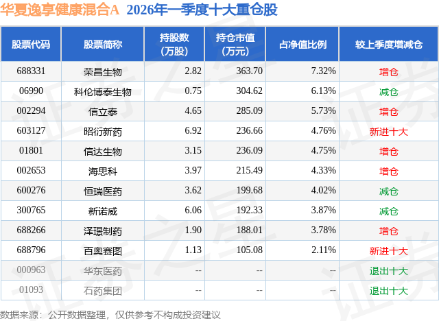 从基金规模来看,华夏逸享健康混合A基金2026年一季度公布的基金规模为0.48亿元,较上一期规模5406.74万元变化了-609.53万元,环比变化了-11.27%。该基金最新一期资产配置为:股票占净值比87.8%,无债券类资产,现金占净值比13.54%。从基金持仓来看,该基金当季前十大股票仓位达46.8%,第一大重仓股为荣昌生物(688331),持仓占比为7.32%。