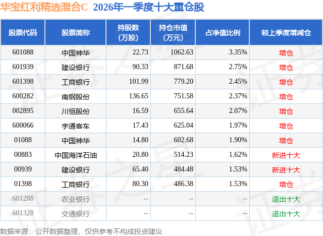 从基金规模来看,华宝红利精选混合C基金2026年一季度公布的基金规模为1.87亿元,较上一期规模1.44亿元变化了4328.93万元,环比变化了30.05%。该基金最新一期资产配置为:股票占净值比94.63%,债券占净值比5.06%,现金占净值比0.65%。从基金持仓来看,该基金当季前十大股票仓位达21.54%,第一大重仓股为中国神华(601088),持仓占比为3.35%。