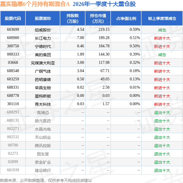 从基金规模来看,嘉实稳惠6个月持有期混合A基金2026年一季度公布的基金规模为3.58亿元,较上一期规模11.91亿元变化了-8.33亿元,环比变化了-69.95%。该基金最新一期资产配置为:股票占净值比2.62%,债券占净值比78.0%,现金占净值比1.88%。从基金持仓来看,该基金当季前十大股票仓位达2.63%,第一大重仓股为纽威股份(603699),持仓占比为0.59%。