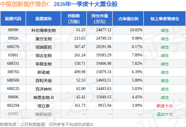 从基金规模来看,中银创新医疗混合C基金2026年一季度公布的基金规模为8.64亿元,较上一期规模9.87亿元变化了-1.23亿元,环比变化了-12.45%。该基金最新一期资产配置为:股票占净值比92.96%,债券占净值比5.3%,现金占净值比0.89%。从基金持仓来看,该基金当季前十大股票仓位达70.42%,第一大重仓股为科伦博泰生物(06990),持仓占比为10.02%。