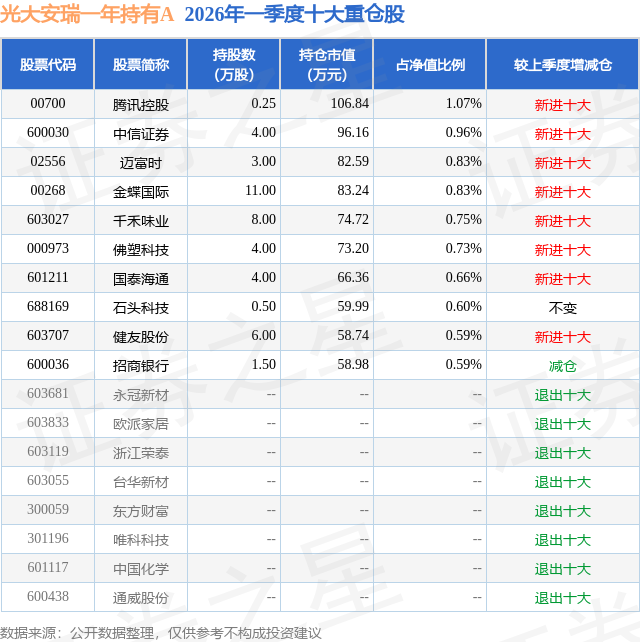 从基金规模来看,光大安瑞一年持有A基金2026年一季度公布的基金规模为0.6亿元,较上一期规模7906.32万元变化了-1874.87万元,环比变化了-23.71%。该基金最新一期资产配置为:股票占净值比17.67%,债券占净值比102.13%,现金占净值比2.35%。从基金持仓来看,该基金当季前十大股票仓位达7.61%,第一大重仓股为腾讯控股(00700),持仓占比为1.07%。