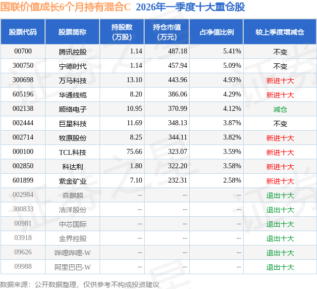 从基金规模来看,国联价值成长6个月持有混合C基金2026年一季度公布的基金规模为0.1亿元,较上一期规模1071.77万元变化了-42.31万元,环比变化了-3.95%。该基金最新一期资产配置为:股票占净值比81.15%,债券占净值比6.38%,现金占净值比17.69%。从基金持仓来看,该基金当季前十大股票仓位达41.28%,第一大重仓股为腾讯控股(00700),持仓占比为5.41%。
