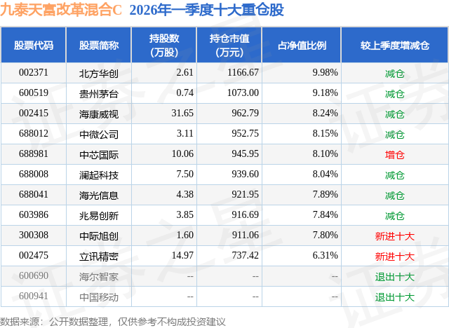 从基金规模来看,九泰天富改革混合C基金2026年一季度公布的基金规模为0.0亿元,较上一期规模69.12万元变化了-44.04万元,环比变化了-63.71%。该基金最新一期资产配置为:股票占净值比93.55%,无债券类资产,现金占净值比7.36%。从基金持仓来看,该基金当季前十大股票仓位达81.53%,第一大重仓股为北方华创(002371),持仓占比为9.98%。