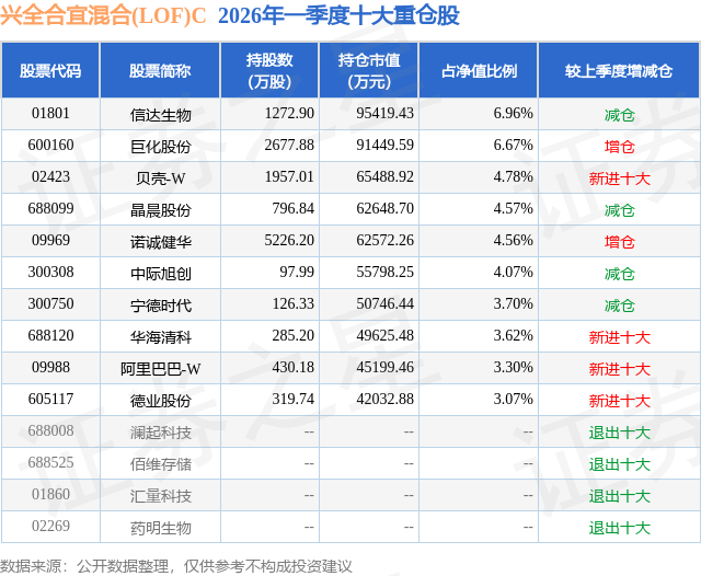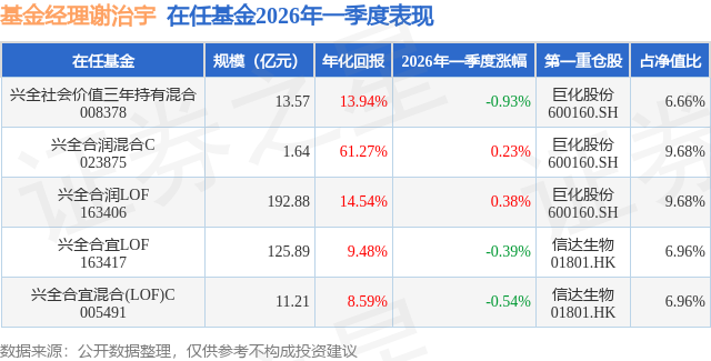 从基金规模来看,兴全合宜混合(LOF)C基金2026年一季度公布的基金规模为11.21亿元,较上一期规模8.44亿元变化了2.78亿元,环比变化了32.92%。该基金最新一期资产配置为:股票占净值比84.94%,债券占净值比6.05%,现金占净值比9.34%。从基金持仓来看,该基金当季前十大股票仓位达45.3%,第一大重仓股为信达生物(01801),持仓占比为6.96%。