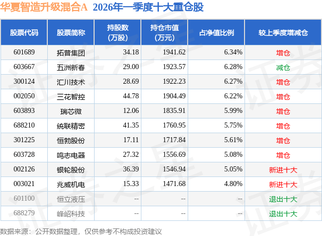从基金规模来看,华夏智造升级混合A基金2026年一季度公布的基金规模为1.46亿元,较上一期规模8244.43万元变化了6330.33万元,环比变化了76.78%。该基金最新一期资产配置为:股票占净值比73.47%,无债券类资产,现金占净值比26.81%。从基金持仓来看,该基金当季前十大股票仓位达57.39%,第一大重仓股为拓普集团(601689),持仓占比为6.34%。