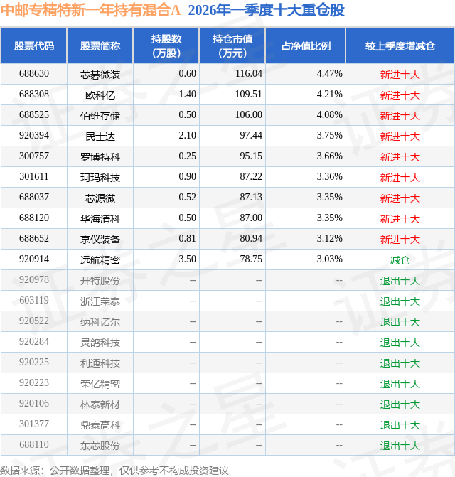 证券之星消息,日前中邮专精特新一年持有混合A基金公布一季报,2026年一季度最新规模0.23亿元,季度净值涨幅为-1.88%。