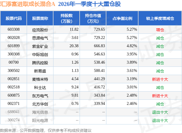 从基金规模来看,汇添富进取成长混合A基金2026年一季度公布的基金规模为1.26亿元,较上一期规模2.02亿元变化了-7569.17万元,环比变化了-37.46%。该基金最新一期资产配置为:股票占净值比80.71%,无债券类资产,现金占净值比19.28%。从基金持仓来看,该基金当季前十大股票仓位达37.95%,第一大重仓股为应流股份(603308),持仓占比为5.27%。