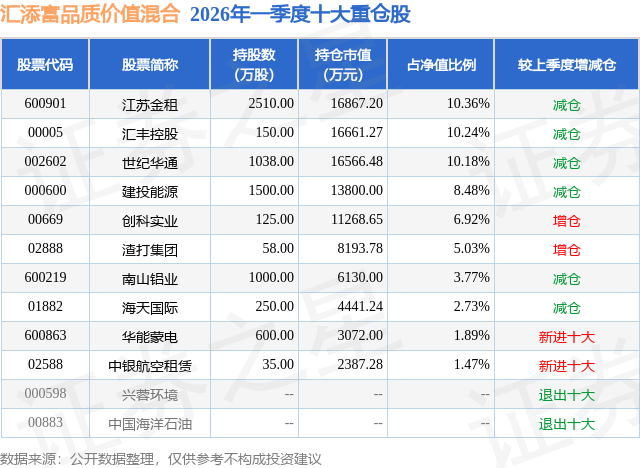 从基金规模来看,汇添富品质价值混合基金2026年一季度公布的基金规模为16.27亿元,较上一期规模36.75亿元变化了-20.48亿元,环比变化了-55.72%。该基金最新一期资产配置为:股票占净值比61.08%,债券占净值比18.46%,现金占净值比7.99%。从基金持仓来看,该基金当季前十大股票仓位达61.07%,第一大重仓股为江苏金租(600901),持仓占比为10.36%。