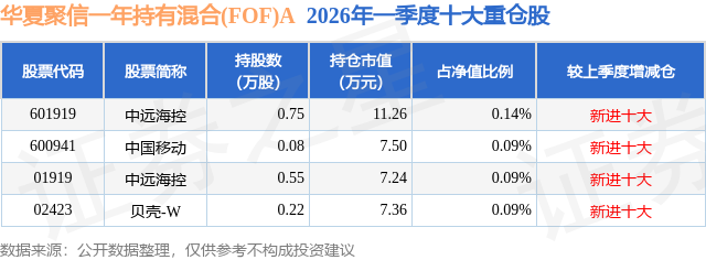 从基金规模来看,华夏聚信一年持有混合(FOF)A基金2026年一季度公布的基金规模为0.54亿元,较上一期规模6467.98万元变化了-1050.52万元,环比变化了-16.24%。该基金最新一期资产配置为:股票占净值比0.42%,债券占净值比4.7%,现金占净值比7.39%。从基金持仓来看,该基金当季前十大股票仓位达0.41%,第一大重仓股为中远海控(601919),持仓占比为0.14%。