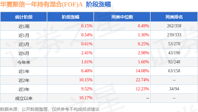 从业绩表现来看,华夏聚信一年持有混合(FOF)A基金过去一年净值涨幅为6.4%,在同类基金中排名63/158,同类基金过去一年净值涨幅中位数为14.08%。而基金过去一年的最大回撤为-1.87%,成立以来的最大回撤为-3.96%。