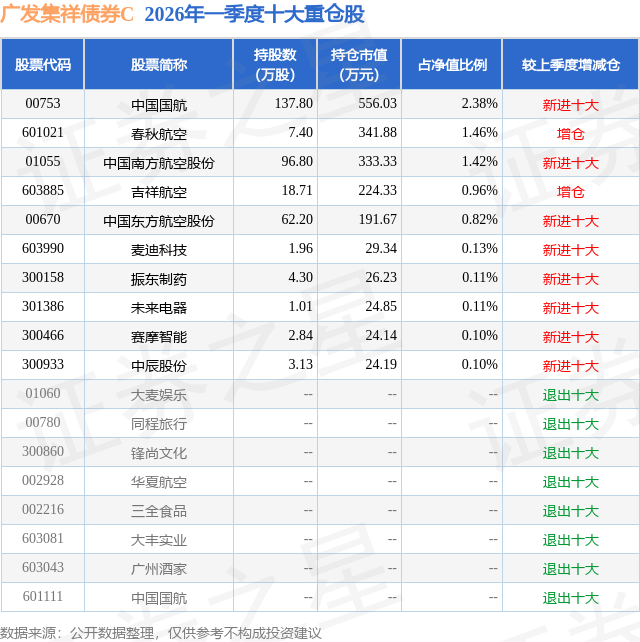 从基金规模来看,广发集祥债券C基金2026年一季度公布的基金规模为0.82亿元,较上一期规模9937.52万元变化了-1741.07万元,环比变化了-17.52%。该基金最新一期资产配置为:股票占净值比9.21%,债券占净值比82.07%,现金占净值比4.68%。从基金持仓来看,该基金当季前十大股票仓位达7.59%,第一大重仓股为中国国航(00753),持仓占比为2.38%。