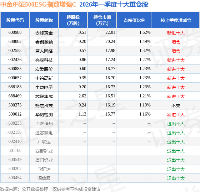 证券之星消息,日前中金中证500ESG指数增强C基金公布一季报,2026年一季度最新规模0.08亿元,季度净值涨幅为0.93%。
