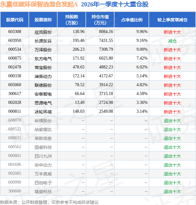 从基金规模来看,永赢低碳环保智选混合发起A基金2026年一季度公布的基金规模为0.62亿元,较上一期规模8216.31万元变化了-2000.97万元,环比变化了-24.35%。该基金最新一期资产配置为:股票占净值比92.34%,债券占净值比1.09%,现金占净值比7.44%。从基金持仓来看,该基金当季前十大股票仓位达62.6%,第一大重仓股为应流股份(603308),持仓占比为9.96%。