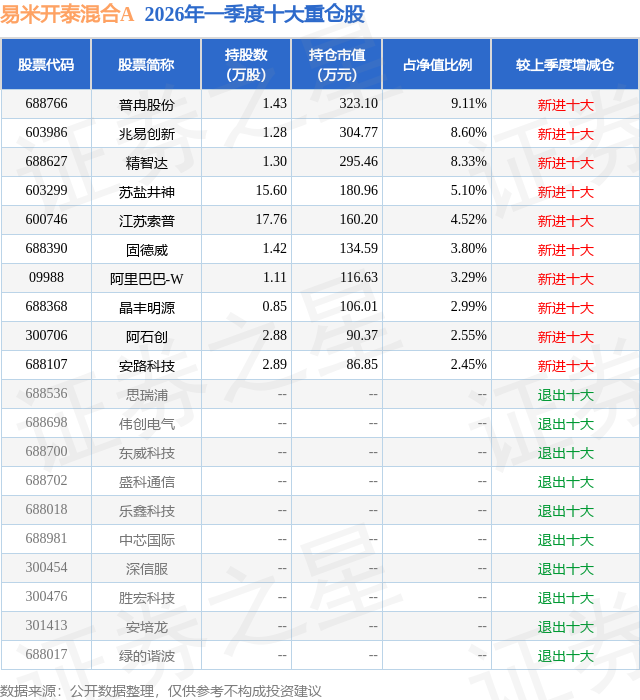 证券之星消息,日前易米开泰混合A基金公布一季报,2026年一季度最新规模0.3亿元,季度净值涨幅为3.38%。