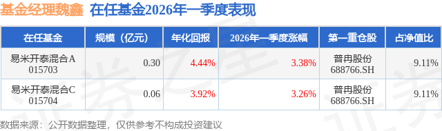 易米开泰混合A现任基金经理为魏鑫,本季度增聘基金经理魏鑫,近期离任的基金经理为贺文奇。其中在任基金经理魏鑫已从业1年又259天,2026年1月8日正式接手管理易米开泰混合A,任职期间累计回报为16.66%。目前还管理着2只基金产品(包括A类和C类),其中本季度表现最佳的基金为易米开泰混合A(015703),季度净值涨幅为3.38%。