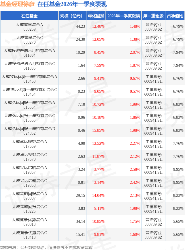 证券之星消息,日前大成弘远回报一年持有混合C基金公布一季报,2026年一季度最新规模0.96亿元,季度净值涨幅为1.86%。