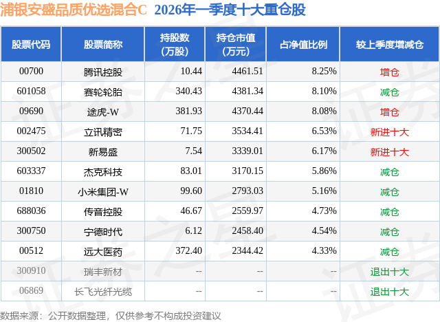 证券之星消息,日前浦银安盛品质优选混合C基金公布一季报,2026年一季度最新规模0.22亿元,季度净值涨幅为-4.68%。