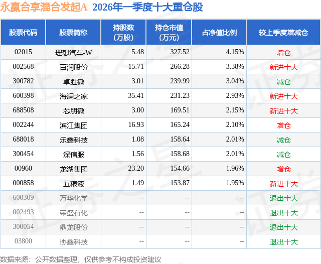 从基金规模来看,永赢合享混合发起A基金2026年一季度公布的基金规模为0.61亿元,较上一期规模1.11亿元变化了-4984.96万元,环比变化了-44.87%。该基金最新一期资产配置为:股票占净值比46.13%,债券占净值比24.57%,现金占净值比9.26%。从基金持仓来看,该基金当季前十大股票仓位达25.68%,第一大重仓股为理想汽车-W(02015),持仓占比为4.15%。
