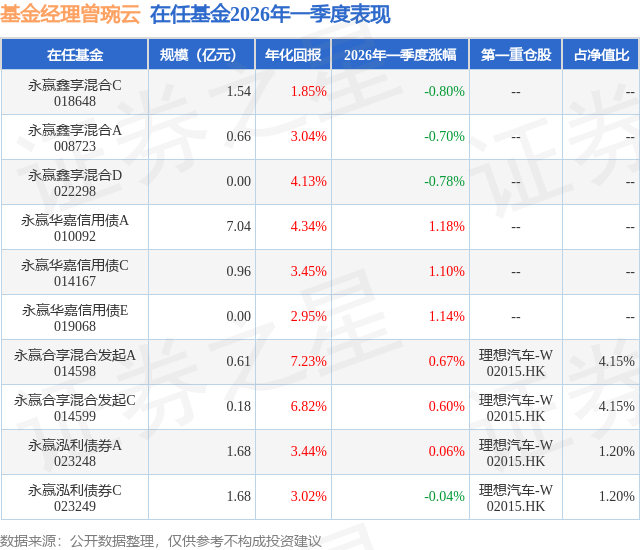 证券之星消息,日前永赢合享混合发起C基金公布一季报,2026年一季度最新规模0.18亿元,季度净值涨幅为0.6%。