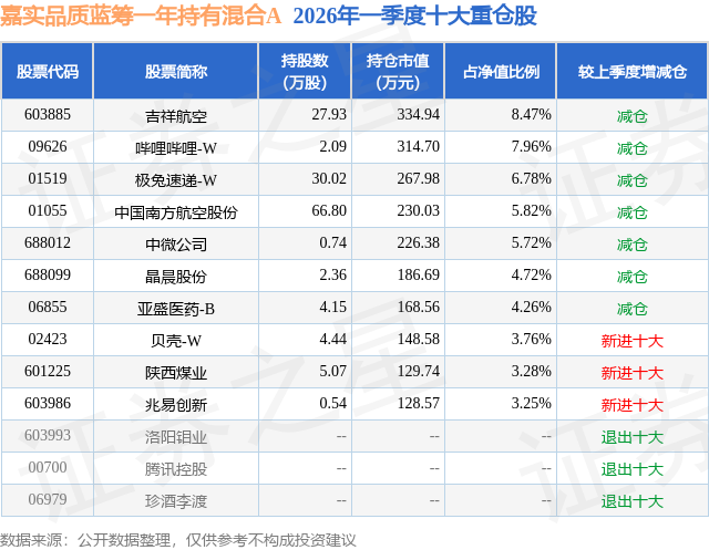 从基金规模来看,嘉实品质蓝筹一年持有混合A基金2026年一季度公布的基金规模为0.37亿元,较上一期规模1.25亿元变化了-8731.68万元,环比变化了-70.06%。该基金最新一期资产配置为:股票占净值比93.22%,无债券类资产,现金占净值比5.7%。从基金持仓来看,该基金当季前十大股票仓位达54.02%,第一大重仓股为吉祥航空(603885),持仓占比为8.47%。