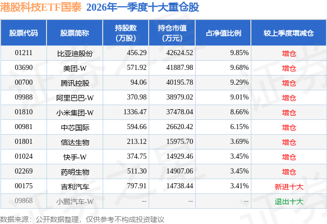从基金规模来看,港股科技ETF国泰基金2026年一季度公布的基金规模为43.26亿元,较上一期规模45.94亿元变化了-2.68亿元,环比变化了-5.83%。该基金最新一期资产配置为:股票占净值比99.46%,无债券类资产,现金占净值比1.25%。从基金持仓来看,该基金当季前十大股票仓位达66.64%,第一大重仓股为比亚迪股份(01211),持仓占比为9.85%。