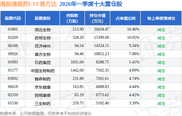 从基金规模来看,港股通医药ETF易方达基金2026年一季度公布的基金规模为15.33亿元,较上一期规模17.97亿元变化了-2.64亿元,环比变化了-14.67%。该基金最新一期资产配置为:股票占净值比98.93%,无债券类资产,现金占净值比1.45%。从基金持仓来看,该基金当季前十大股票仓位达64.22%,第一大重仓股为信达生物(01801),持仓占比为10.46%。